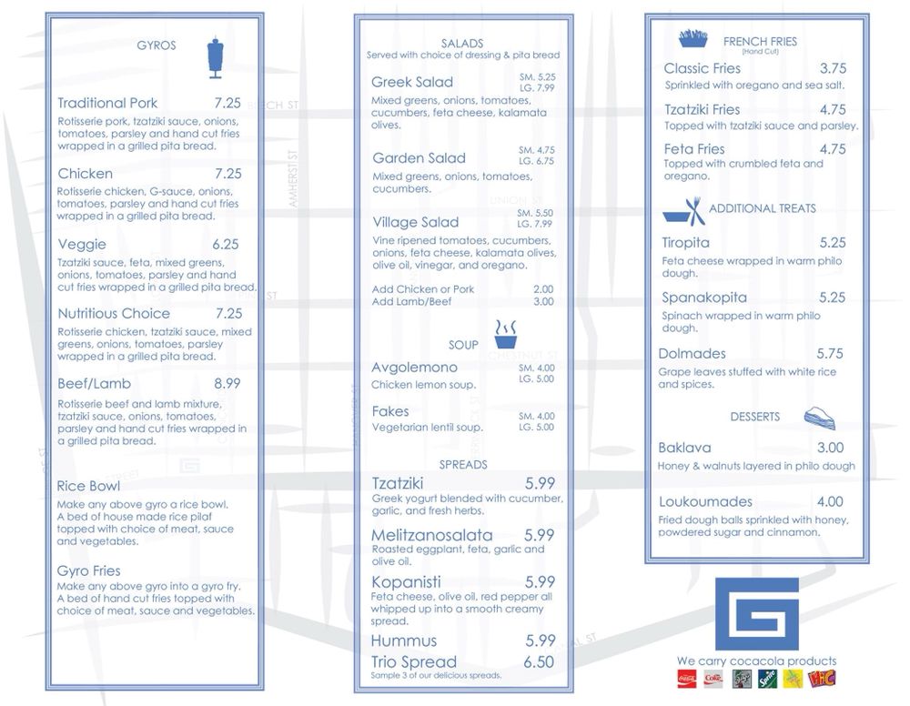 A bed of seasoned fries topped with all of the meats! Tzatziki, "G-Sauce", onions, tomatoes and parsley