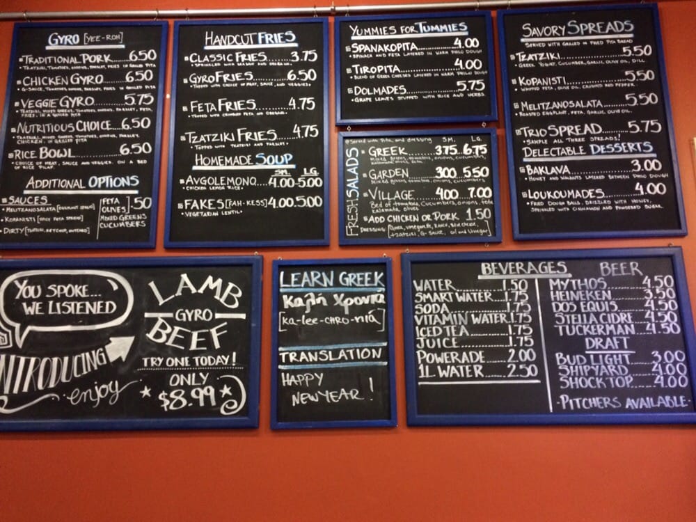 Rotisserie pork, tzatziki sauce, chopped onions tossed in parsley, chopped tomatoes, and seasoned fries wrapped in a grilled pita.