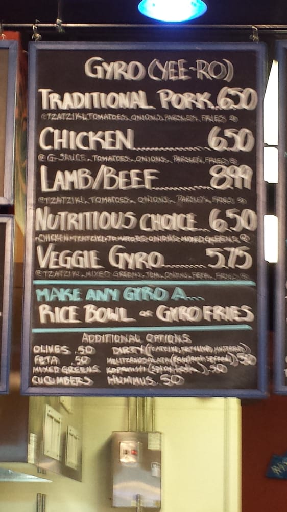 Rotisserie pork. Topped with tzatziki, "G-Sauce", tomatoes, onions, mixed greens wrapped in a flour tortilla.